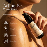 A soothing full-body massage blend crafted with Coconut oil, Sunflower oil, Sesame oil, jojoba oil and castor oil. Infused with essential oils like rose, jasmine, ylang-ylang, vanilla, oud, sandalwood, patchouli and sweet orange for deep relaxation, muscle ease, and spa-like aromatherapy at home.